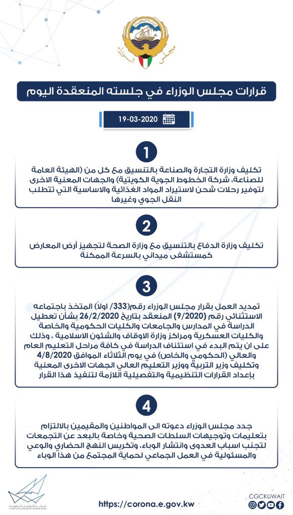 مركز التواصل الحكومي Pa Twitter قرارات مجلس الوزراء في جلسته المنعقدة يوم الثلاثاء 31 3 2020 Cgckuwait